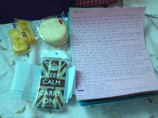 This is what she brought me back. A 4 page letter which contains how we met and our amazing memories together. A "keep calm and carry on " case. Biscuits from HK, it was so good.